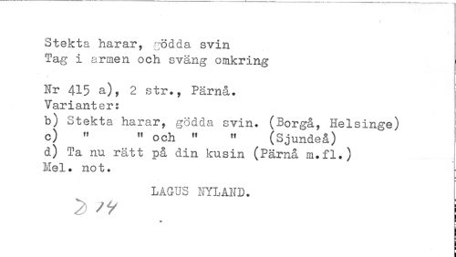 //// Stekta harar, gödda svin Tag i armen och sväng omkring //// Nr 415 a), 2 str., Pärnå. Varianter: //// b) Stekta harar, gödda svin. (Borgå, Helsinge) //// c) " » och M " (Sjundeå) //// d) Ta nu rätt på din kusin (Pärnå m.fl.) Mel. not. //// LAGUS NYLAND. //// 2> j //// • f ////