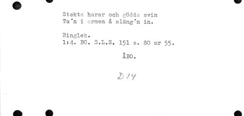 //// i //// Stekta harar och gödda svin Ta'n i armen å släng'n in. //// Ringlek. //// 1:4. BO. S.L.S» 151 s. 80 nr 55. //// ÅBO. //// 2>ii ////