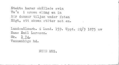 //// Stekta harar skållade svin Ta 'n i armen släng en in Har dansar tiljan under foten Högt, att skoen stöter mot en. //// Landsmålsark. i LuncU 159. Uppt. 22/9 1875 av Hans Emil Larsson. Sk. D 1Aj> Yemmenhögs hd. //// HORD MUS. //// _ _ _... __ _ ___ __ __ ___ ////