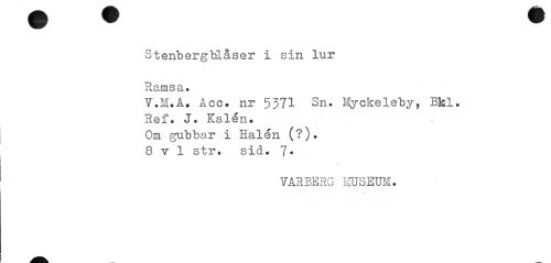 //// w w 9 //// Stenbergblåser i sin lur Ramsa. //// V.M.A. Åcc. nr 5371 Sn. Myckeleby, Bkl. Ref. J. Kalén. Om gubbar i Halén (?)• 8 v 1 str. sid. 7* //// VARBERG- MUSEUM. ////