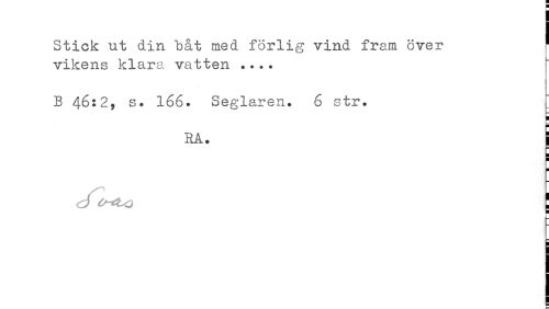 //// Stick ut din "båt med förlig vind fram över f //// vikens klara vatten //// B 46:2, s. 166. Seglaren. 6 str. " //// ra. j //// ¦ //// tfo~<l<Q C //// ¦ ////