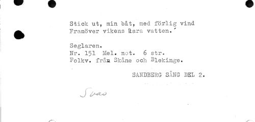//// Stick ut, min båt, med förlig vind. ^^ Framöver vikens Rara vatten.' //// Seglaren. //// Fr. 151 Mel. not. 6 str. Folkv. från Skåne och Blekinge. //// SANDBERG SÅNG DEL 2. //// J ^^ ////