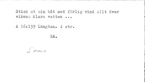 //// Stick ut min båt med förlig vind allt över vikens klara vatten ... //// ' Å 16:139 Längtan. 4 str. //// HA. ////