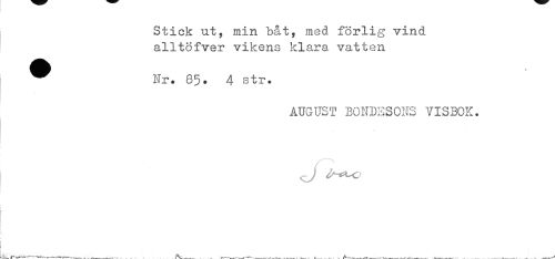 //// Stick ut, min båt, med förlig vind alltöfver vikens klara vatten //// ^^ Nr* 85. 4 str. //// AUGUST BONDESONS VISBOK. //// C j c ////