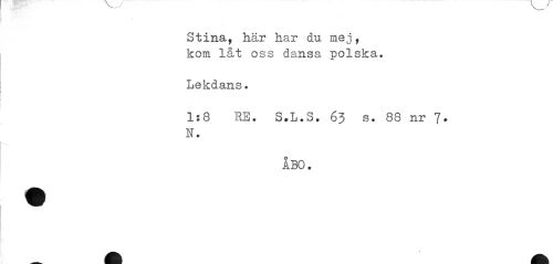 //// Stina, här har du mej, kom låt oss dansa polska. //// Lekdans. //// 1:8 RE. S.L.S. 63 s. 88 nr 7* N# //// ABO. ////