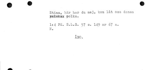 //// Stina, här har du mej, kom låt oss dansa jsisiskax polka. //// 1:4 PE. S.L.S. 57 s. 149 nr 67 a. N. //// ABO. ////