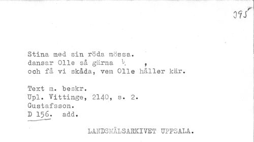 //// Of/ //// Stina med sin röda mössa. //// dansar Olle så gärna k , //// och få vi skåda, vem Olle håller kär. //// Text m. beskr. //// Upl. Vittinge, 2140, s. 2. //// Gustaf //// 8 S O II ? //// D 15 6* adcL //// LANDS KAL SARKIVET UPPSALA. ////