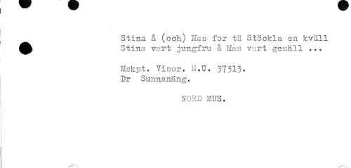 //// Stina å (och) Mas for tä Stöckla en kväll ^^ Stina vart jungfru å Mas vart gesäll //// Mskpt. 'Visor. E.TJ. 37313* Dr Sunnanäng. //// NOHD MUS. ////