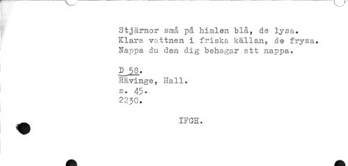 //// Stjärnor små på himlen blå, de lysa. Klara vattnen i friska källan, de frysa. //// Nappa du den dig behagar att nappa. //// D 53. //// Rävinge, Hal1. //// s. 45. 2250. //// ^^^ ifgh • ////