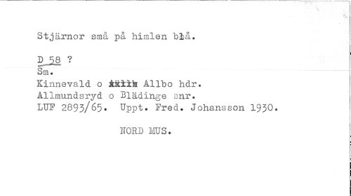 //// Stjärnor små på himlen blå. //// D ? f //// Sm. //// Kinnevald o åäiife Ål Ib o hdr. //// Allmundsryd o Blädinge snr. //// LtJF 2893/65. Uppt. Fred. Johansson 1930. //// HORD MUS. //// i ////