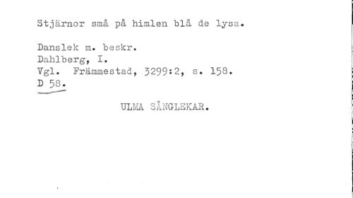 //// Stjärnor små på himlen blå de lysa. //// Danslek m. "beskr. Dahlberg, I. //// Ygl. Frammestad, 3299:2, s. 158. j //// D 58. ! //// ULM SÅNGLEKAR. //// i ////