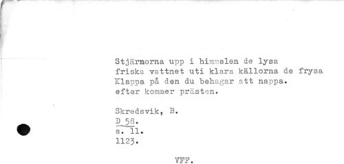 //// y //// Stjärnorna upp i himmelen de lysa friska vattnet uti klara källorna de frysa Klappa på den du behagar att nappa, efter kommer prästen. //// A //// v //// Skredsvik, B. //// 5^58. //// s. 11. 112J. //// VFF. ////