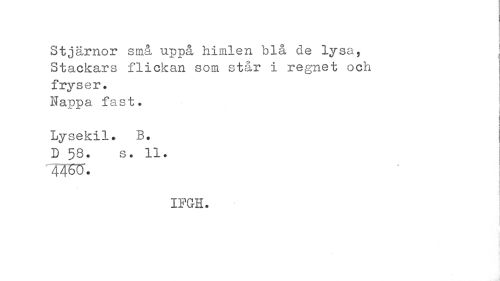 //// Stjärnor små uppå himlen blå de lysa, \ //// Stackars flickan som står i regnet och fryser. Kappa fast. //// i //// Lysekil. B. D 58. s. 11. //// XFGH. ////