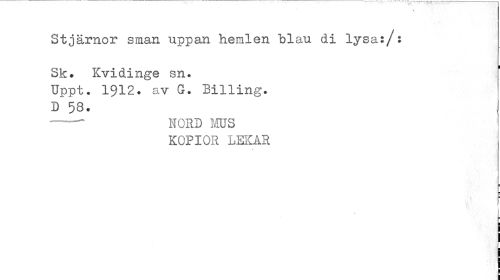 //// Stjärnor sman uppan hemlen blau di lysa:/: //// Sk. Kvidinge sn. //// Uppt. 1912. av G. Billing. //// D 58. //// ---MORD MUS //// KOPIOR LEKAR //// ¦ //// ¦ ////