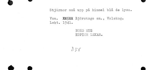 //// Stjärnor små upp på himmel blå de lysa. Vsm. EXP&K Björskogs sn. , Valskog. //// Lekt. 1941. //// NORD MUS KOPIOR LEKAR. //// b ////