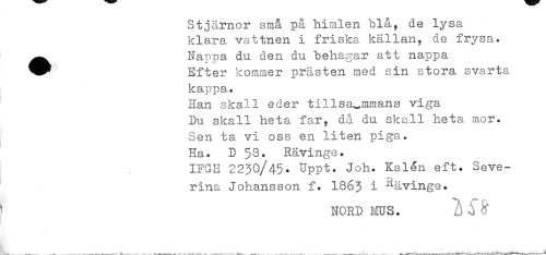 //// Stjärnor små på himlen blå, de lysa klara vattnen i friska källan, de frysa» //// •Nappa du den du behagar att nappa //// Efter kommer prästen med sin stora svarta //// kappa. //// Han skall eder tillsa^mmans viga Du skall heta far, då du skall heta mor. Sen ta vi oss en liten piga. Ha. D 58. Rävinge. //// IFGH 2230/45. Uppt. Joh. Kalén eft. Seve-rina Johansson f. I863 i ^ävinge* //// nord mus. i 6 fr //// ¦ - - ---— — —--w-' -A J aj^u^a1 i, ^j..., . w-^ ... ...--^^ .—__^ ___w___t**.. v». ,_.v .. , t. t^jn^-wH^w^ ¦¦¦ . ////