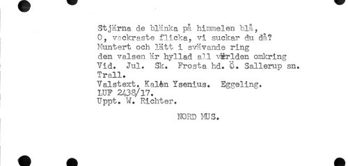 //// Stjärna de blänka på himnielen blå, O, vackraste flicka, vi suckar du då? Muntert och lätt i svävande ring den valsen är hyllad all världen omkring Vid» Jul. Sk, Frosta hd. Sallerup sn. Trall. //// Valstext. Kalén Ysenius. Eggeling. //// LUF 2438/17. //// Uppt. W. Richter. //// nord ms. ////