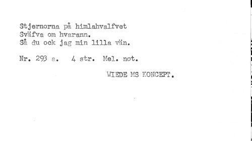 //// Stjernorna på himlahvalfvet Sväfva om hvarann. //// Så du ock jag min lilla vän. C //// Nr. 293 a. 4 str. Mel. not. i //// WIEDE MS KONCEPT. j //// ¦ //// ¦ ////