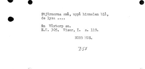 //// Stjärnorna små, uppå himmelen blå, ^^ de lysa »... //// Sm Våxtorp sn. //// E.U. 305. Visor, I. s. 119. //// % //// NORD MUS. //// T>S* ////