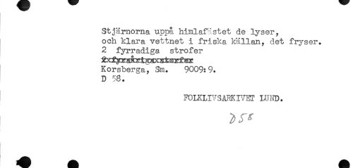 //// Stjärnorna uppå himlafästet de lyser, //// och klara vettnet i friska källan, det fryser. //// 2 fyrradiga strofer //// Korsherga^ Sm. 9009:9. D 58. //// FOLKLIVS ARK IVET Kl 'HD. ////