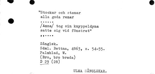 //// "Stockar och stenar ^^ alla goda renar //// /Anna/ tog sin knyppeldyna satte sig vid fönstret11 //// Sånglek* //// Sdml. Bettna, 4863, s. 54-55. Palmblad, W. (Bro, bro breda) //// D 29 (28) //// ULMÅ SÅNGLEKAR. ////