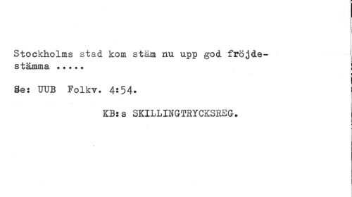 //// Stockholms stad kom stäm nu upp god fröjdestämma ... //// i //// ges UUB Folkv. 4:54. //// KB:s SKILLINGTRYCKSRBG. ////