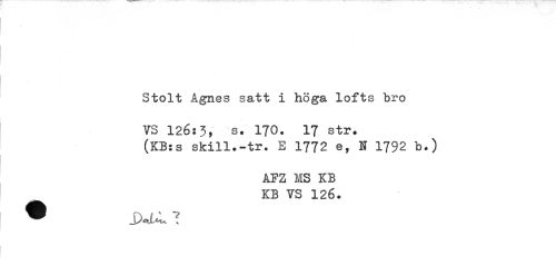 //// Stolt Agnes satt i höga lofts bro //// VS 126:3, s. 170. 17 str. //// (KB:s skill.-tr. E 1772 e, H 1792 b.) //// AFZ MS KB KB YS 126. ////