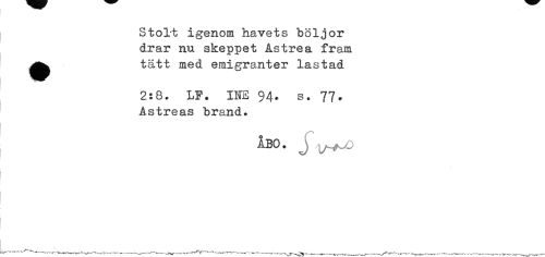 //// StoUt igenom havets böljor drar nu skeppet Åstrea fram ^^ tätt med emigranter lastad //// 2:8. LP. IHE 94* s. 77. //// Astreas brand. //// ÅBO. j Xh^O ////