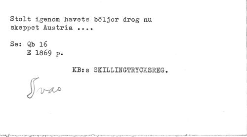 //// Stolt igenom havets böljor drog nu skeppet Austria ... //// Se: Qb 16 //// E I869 p. //// KB:s SKILLINGTRYCKSREG. ////