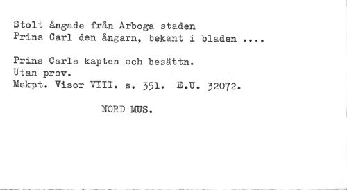 //// Stolt ångade från Arboga staden //// Prins Carl den ångarn, bekant i bladen •••• //// Prins Carls kapten och besättn. Utan prov. //// Mskpt. Visor VIII. s. 351. B.U. 32072. //// NORD MUS. ////