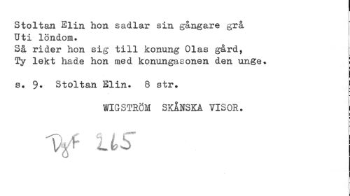 //// Stoltan Slin hon sadlar sin gångare grå Uti löndom. //// Så rider hon sig till konung Olas gård, //// Ty lekt hade hon med konungasonen den unge. ! //// s. 9* Stoltan Elin. 8 str. //// WIGSTRÖM SKÅNSKA VISOR. ////