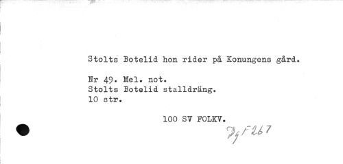 //// Stolts Botelid hon rider på Konungens gård. //// Hr 49* Mel. not. //// Stolts Botelid stalldräng. 10 str. //// 100 SV FOLKV. //// • fU 7 ////