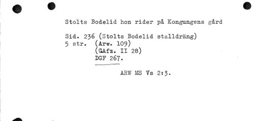 //// Stolts Bodelid hon rider på Kongungens gård //// Sid. 236 (Stolts Bodelid stalldräng) 5 str. (Arw. 109) //// (Oåfz. II 28) //// DGF 267. //// ARV/ MS Vs 2:3. ////
