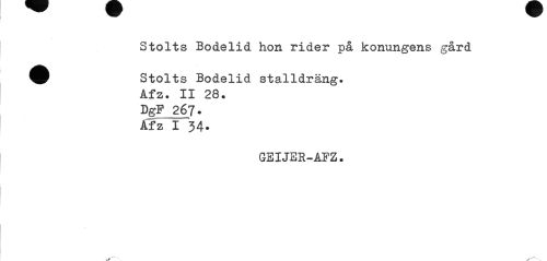 //// Stolts Bodelid. hon rider på konungens gård //// Stolts Bodelid stalldräng. Afz. II 28. DgP 267. //// Afz I 34. //// GEIJER-AFZ. ////