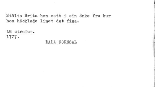 //// : //// ! \ //// ¦ //// Stålts Brita hon satt i sin änke fru "bur hon häcklade linet det fina. //// : //// 18 strofer. 1 //// 1727. i //// DALA FGMSAL //// i //// 1 //// 1 //// 1 //// 1 //// i < //// 1 ////