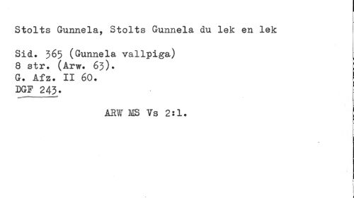//// Stolts Gunnela, Stolts Gunnela du lek en lek Sid. 365 (Gunnela vallpiga) //// 8 str. (Arw. 63). j //// G. Afz. II 60. //// DGF 243* //// 11 — . ¦ ——• //// ARW MS Vs 2:1. ////