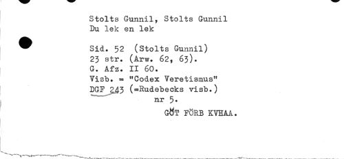//// Stolts Gunnil, Stolts Gunnil Du lek en lek //// ® Sid. 52 (Stolts Gunnil) //// 23 str. (Arw. 62, 63). G, Afz. II 60. Yisb. « MCodex VeretismusM DGP 243 (»Rudebecks visb.) //// nr 5. //// GÖT FÖRB KVHAA. ////