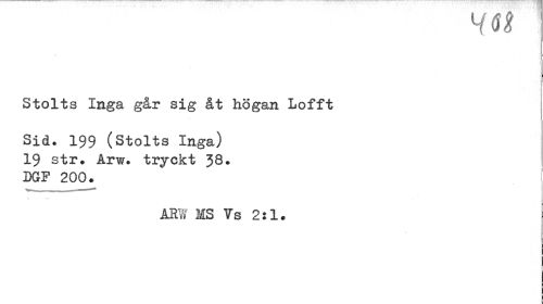 //// HoS //// i //// Stolts Inga går sig åt högan Lofft //// Sid. 199 (Stolts Inga) 19 str. Arvf. tryckt 38» DGF 200. //// ARW IS Vs 2:1. ////