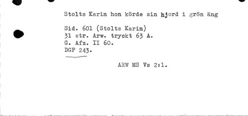 //// Stolts Karin hon körde sin hjord i grön äng //// Sid. 601 (Stolts Karin) ^^ 31 str. Arw. tryckt 63 A. //// G. Afz. II 60. //// DGF 243. //// ARW MS Vs 2:1. ////