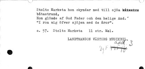 //// Stolts Märke t a hon skyndar ned till sjöa fcåtastrx båtastrand, //// Hon glömde af Gud Fader och den helige And» ' MI ron mig öfver sjöjen med de åror". //// s. 57. Stolts Märketa 11 str. Mel. //// LANDTMAFSON TÄSTERG MUSIKBIL. //// . t ////