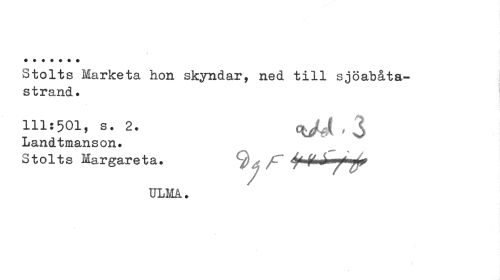 //// Stolts Marketa hon skyndar, ned till sjöabåta-strand* //// 111:501, s • 2. qjA , 3 //// Landtmanson. //// Stolts Margareta* ^ ; ^ f*lKf //// ULMA. ////