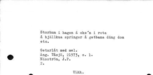 //// Storhun i hagan å oks'n i rota å bjällkua springer å getbana däng dom eto. //// Getarlåt med mel. ^ Äng. Tåsjö, 21973» s• 1. //// Näsström, J.P. 2. ////