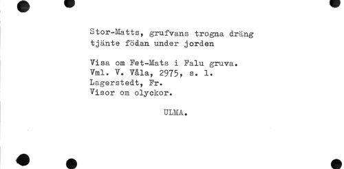 //// Stör-Matts, grufvans trogna dräng tjänte födan under jorden //// Visa om Fet-Mats i Falu gruva. //// Vml. V. Tåla, 2975, -s. 1. //// Lagerstedt, Fr. Visor om olyckor. //// ULM A* ////