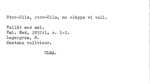 //// i //// Stor-Olla, stor-Olla, nu släppa vi vall. //// Vallåt med mel» Vml. Hed, 2832:1, s. 1-2. Lagergren, E. Enstaka vallvisor. //// ULMA. ////