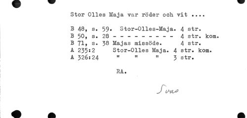 //// Stor Olles Maja Tar roder och vit ... //// B 48, s. 59* Stor-Olles-Maja. 4 str. B 50, s. 28 - -- -- --- - 4 str. kom. B 71, s. 58 Majas missöde. 4 str. A 235*2 Stor-Ölles Maja. 4 str* kom. A 326:24 " " n 3 str. //// RA. //// j ////
