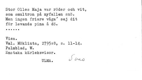 //// Stor Olles Maja var röder och vit, som smultron på nyfallen snö. Men ingen friare våga/ sej dit för levande pina å dö. //// Vx sst • //// Vml. Möklinta, 2795$8, s. 11-14. //// Palmblad, W. //// Enstaka kärleksvisor. //// ULM. ////