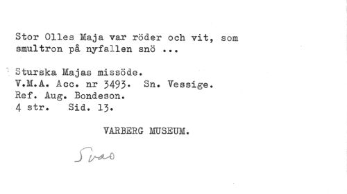 //// Stor Olles Maja var roder och vit, som smultron på nyfallen snö ... //// \ Sturska Majas missöde. //// V.M.A. Aee. nr 5493? Vessige. //// Ref. Åug. Bondeson. 4 str. Sid. 13. //// VÅRBERG MUSEUM. //// J i^uQ //// •K ////