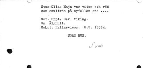 //// Stor-Ollas Maja var viter och röå som smultron på nyfallen snö ... //// Hot. Uppt. Carl Viking. Sm Älghult. //// Mskpt. Hallarvisor. E.U. 18534* //// HORD MUS. //// t //// Si^U) ////