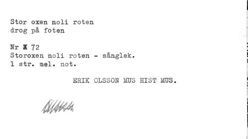 //// Stor oxen noli roten drog på foten //// Nr I 72 ! //// Storoxen noli roten - sånglek. | //// 1 str. mel. not. [ //// ERIK OLSSON MUS HIST MUS. ! //// Mm I //// j ////