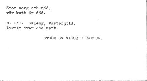//// Stor sorg och nöd, vår katt är död. //// i //// s. 240. Saleby, Västergtld. Diktat över död katt. //// STRÖM SY YISOR O RAMSOR. //// L i ////